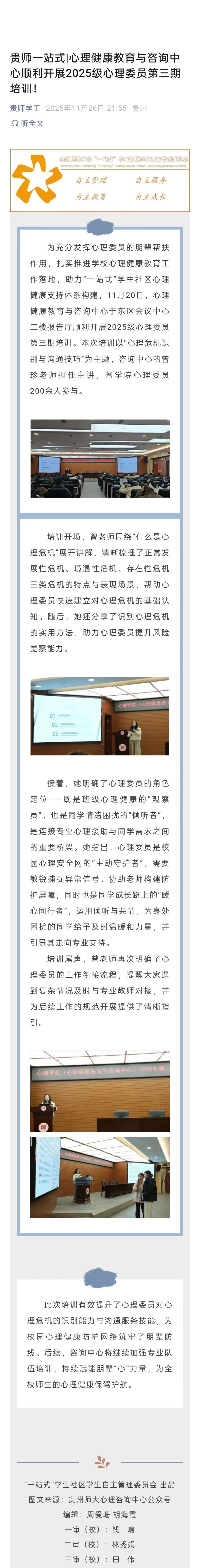 贵师一站式|心理健康教育与咨询中心顺利开展2025级心理委员第三期培训!