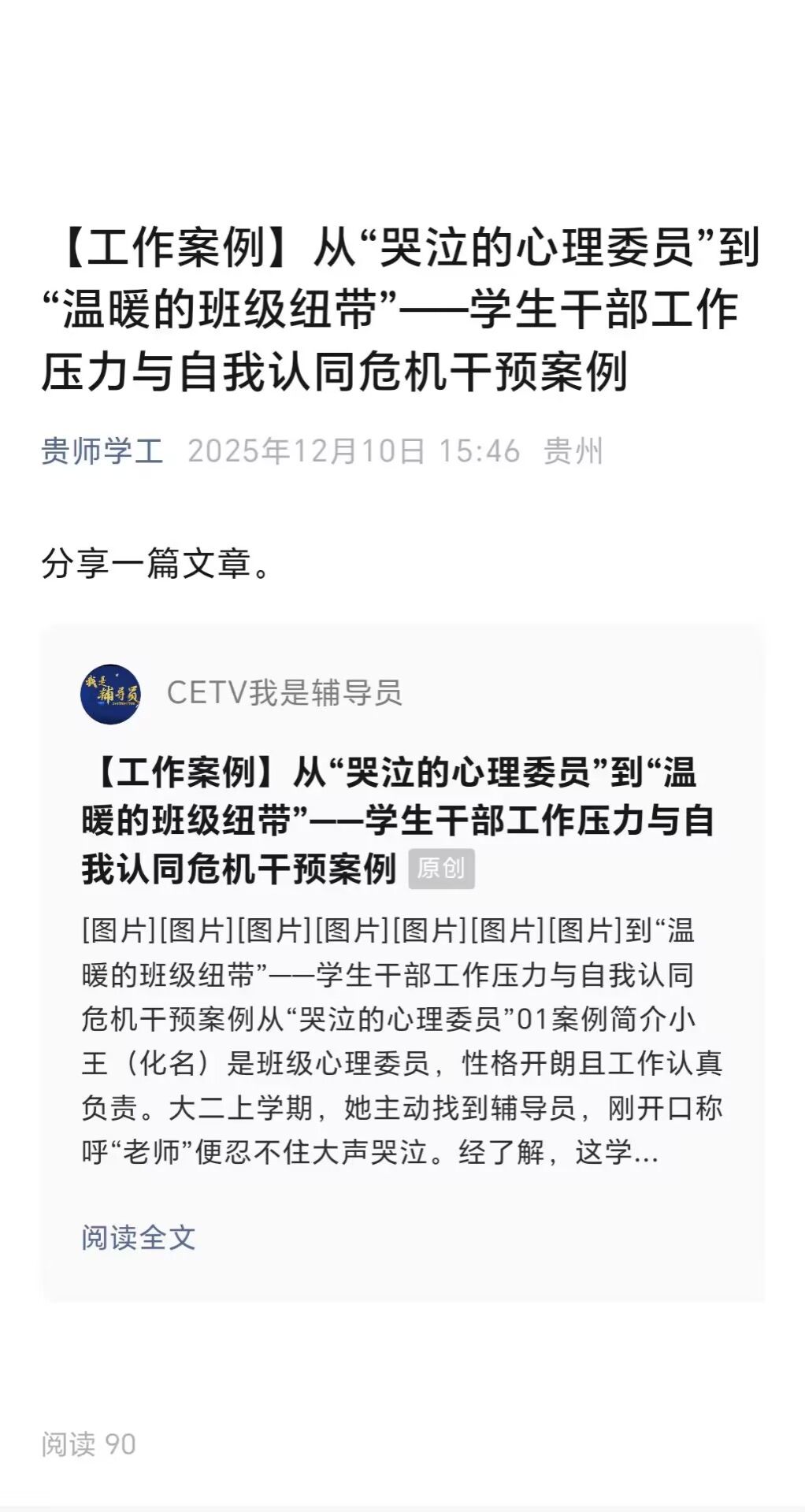 【工作案例】从“哭泣的心理委员”到“温暖的班级纽带”——学生干部工作压力与自我认同危机干预案例