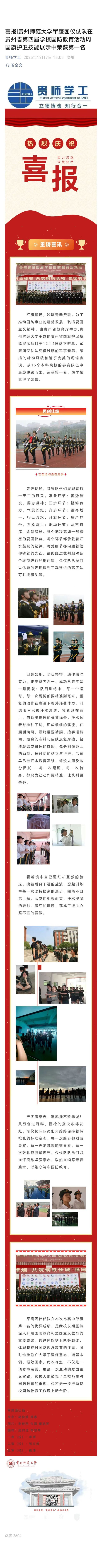 喜报|贵州师范大学军鹰团仪仗队在贵州省第四届学校国防教育活动周国旗护卫技能展示中荣获第一名
