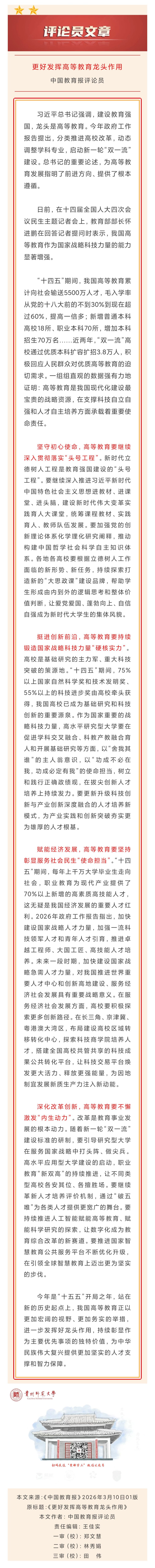 中国教育报评论员:更好发挥高等教育龙头作用|关注民生主题记者会评论